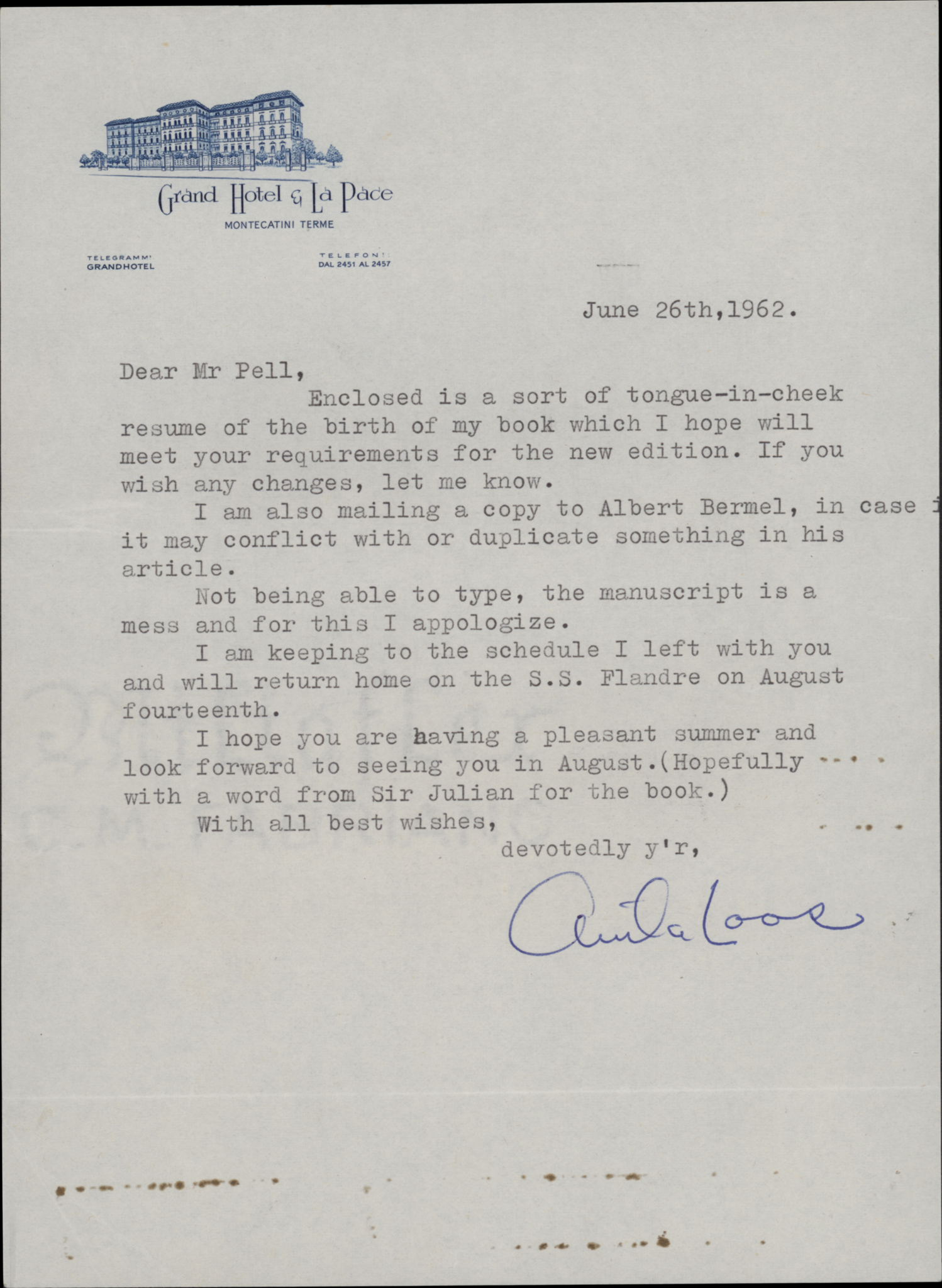Typed letter signed, dated “June 26th, 1962” by the American actress, novelist, playwright. She became the first female staff screenwriter in Hollywood, when D. W. Griffith put her on the payroll at Triangle Film Corporation. She is best known for her 1925 comic novel “Gentlemen Prefer Blondes”. Addressed to Mr. Pell: “…Enclosed is a sort of tongue-in-cheek resume of the birth of my book which I hope will meet your requirements for the new edition…”. 1s p. In-4. With letterhead “Grand Hôtel et La Pace/Montecatini Terme”.