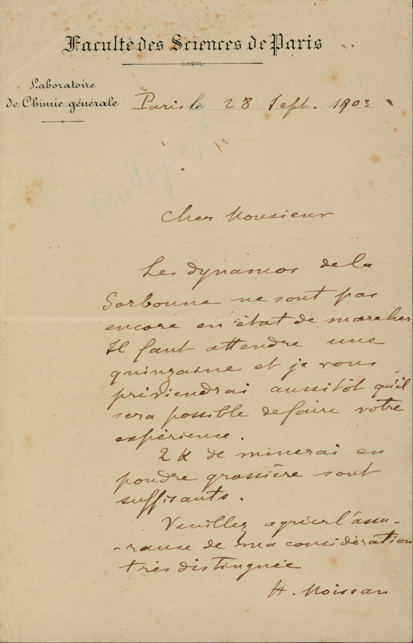 Autograph letter signed, dated “Paris le 28 Sept. 1903” by the French chemist and pharmacist, awarded with the 1906 Nobel Prize in Chemistry for his work in isolating fluorine from its compounds. Moissan contributed also to the development of the electric arc furnace, which opened several paths to developing and preparing new compounds, [and attempted to use pressure to produce synthetic diamonds, from the more common form of carbon. He was one of the original members of the International Atomic Weights Committee. Scientific letter addressed to a collaborator: “…Les dynamos de la Sorbonne ne sont pas encore en état de marcher. Il faut attendre une quinzaine et je vous préviendrai aussitôt qu’il sera possible de faire votre experience. 2K de minerai en poudre grossière sont suffisants…”. 1 p. With letterhead “Faculté des Sciences de Paris/Laboratoire de Chimie générale”. Rare.