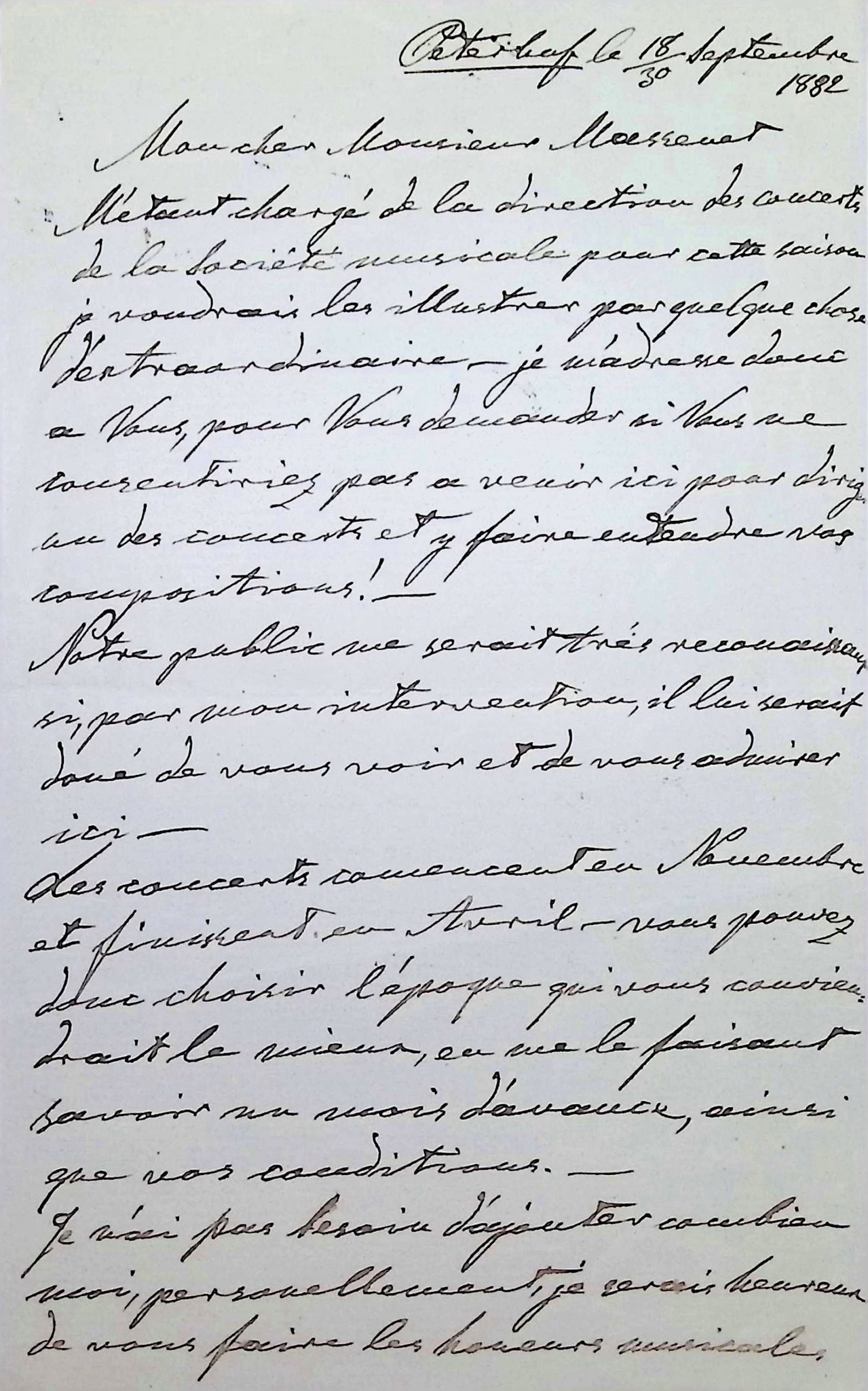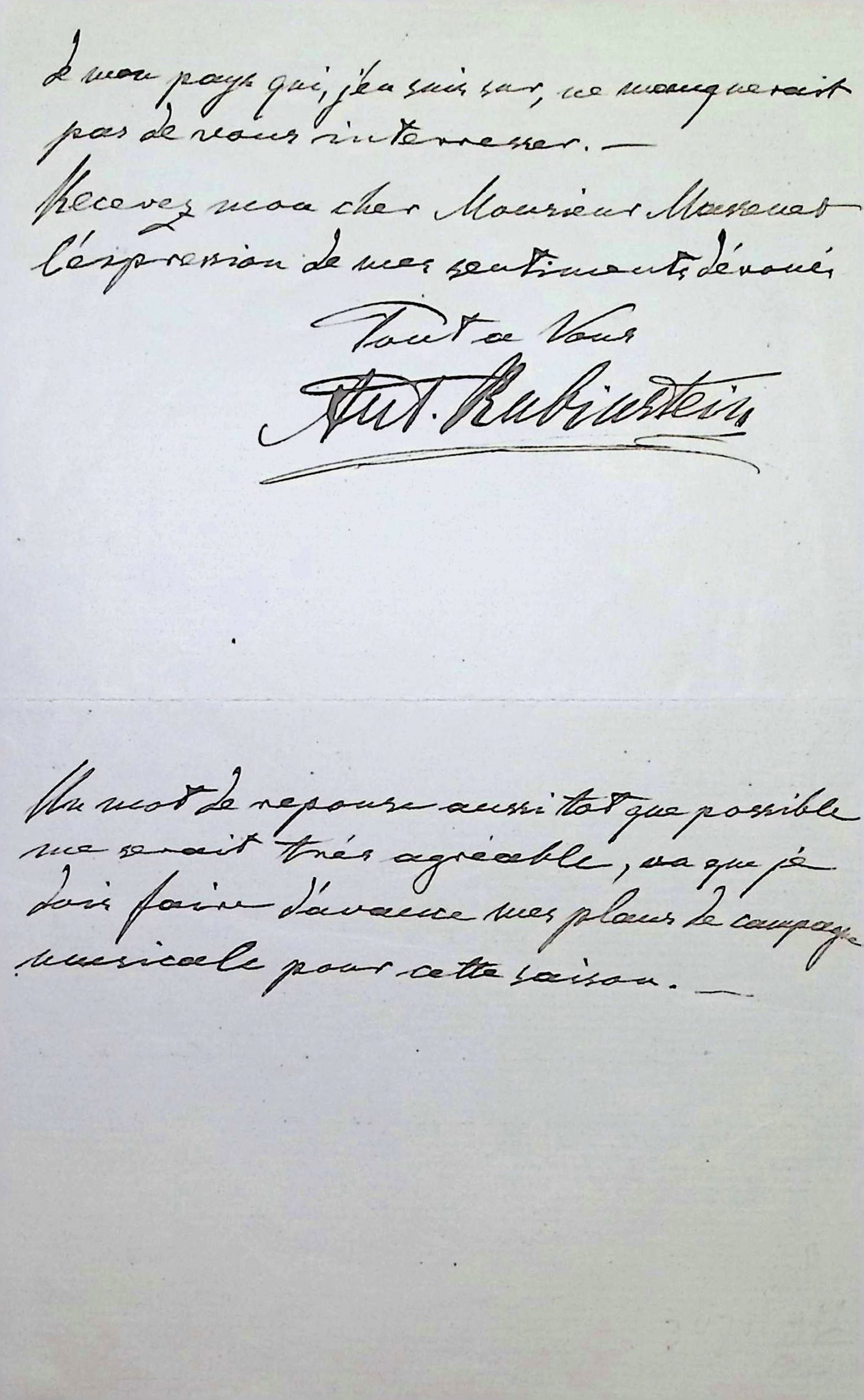 Autograph letter signed, dated “Peterhof le 18 septembre 1882” by the Russian pianist, composer and conductor, who founded the Saint Petersburg Conservatory. He became most famous for his series of historical recitals, seven enormous, consecutive concerts covering the history of piano music. He wrote 20 operas, the best known of which is The Demon. He composed many other works, including five piano concertos, six symphonies and many solo piano works along with a substantial output of works for chamber ensemble. Addressed to the composer Jules Massenet, inviting him to give concerts in Saint-Petersburg.: “…N’étant chargé de la direction des concerts de la société musicale pour cette saison je voudrais les illustrer par quelque chose d’extraordinaire. Je m’adresse donc à vous, pour vous demander si vous ne consentiriez pas à venir ici pour diriger un des concerts et y faire entendre vos compositions! – …”. 2 pp. In-8.