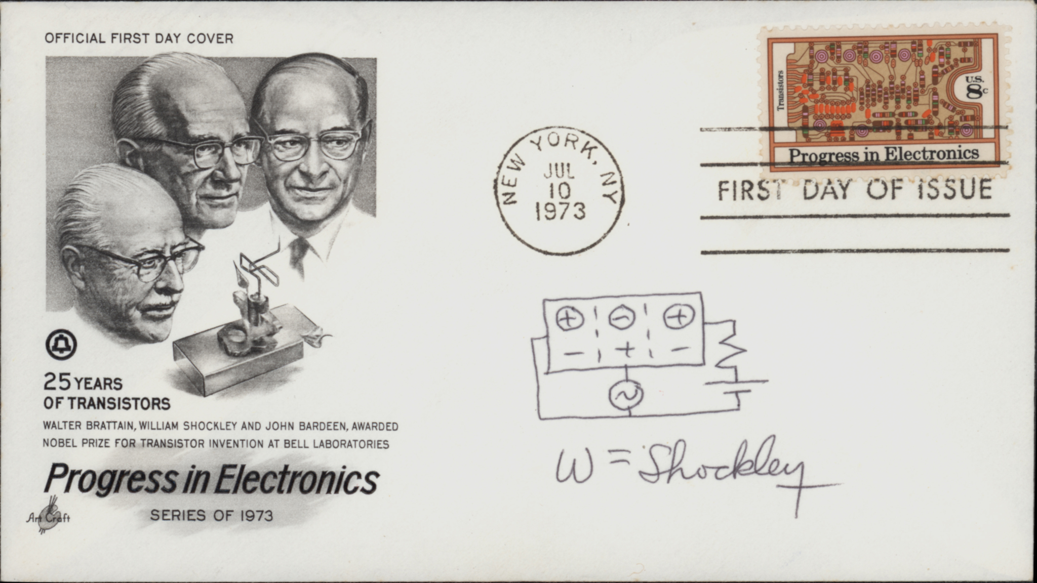 Autograph signature and sketch, postmarked “JUL 10 1973” by the American inventor, physicist, and eugenicist. He was the manager of a research group at Bell Labs that included John Bardeen and Walter Brattain. The three scientists were jointly awarded the 1956 Nobel Prize in Physics for "their researches on semiconductors and their discovery of the transistor effect". Above his signature, Shockley pens a sketch of his famous inventions. On commemorative First day cover of the 25th anniversary of the invention of the transistors. (16.5 x 9 cm).