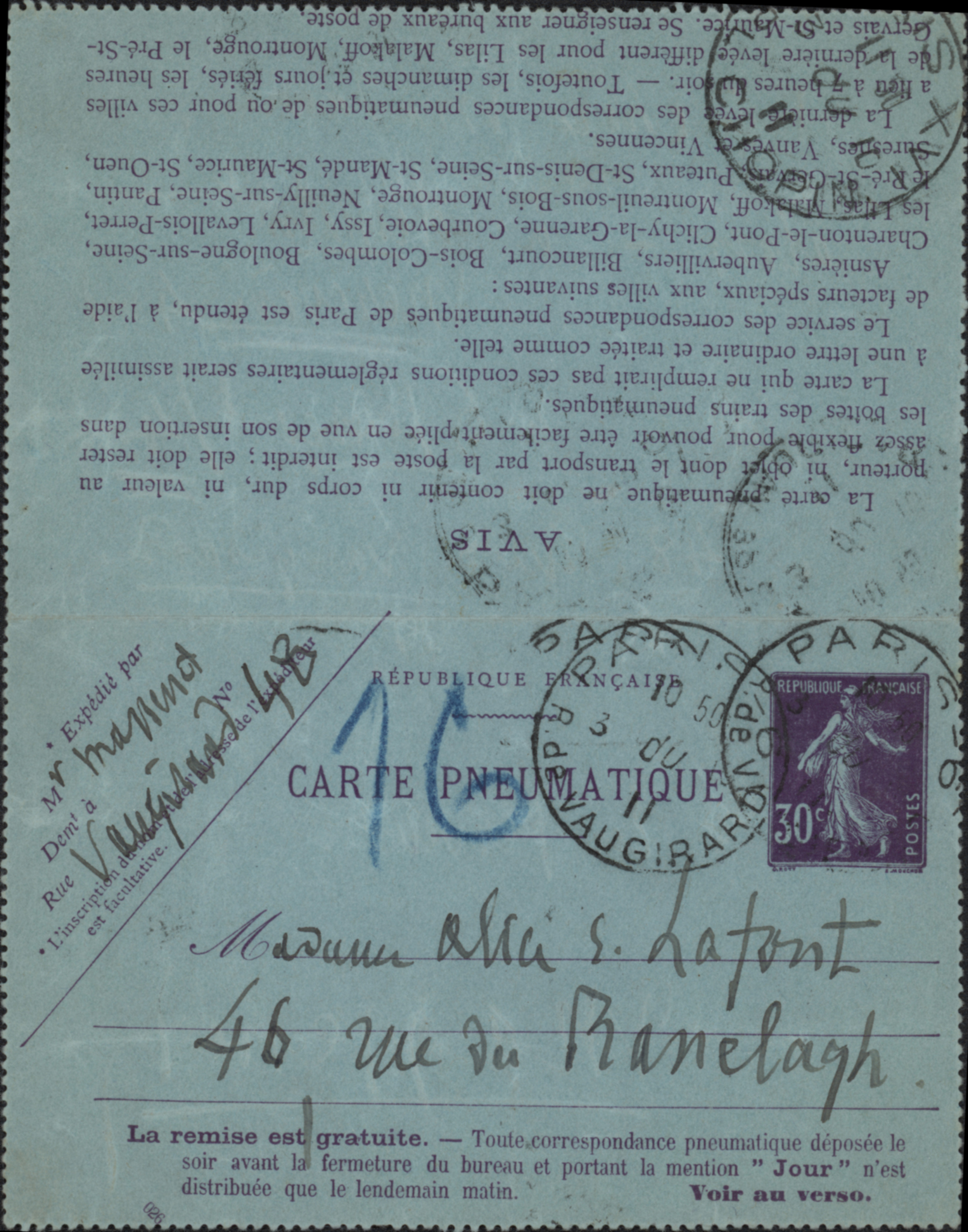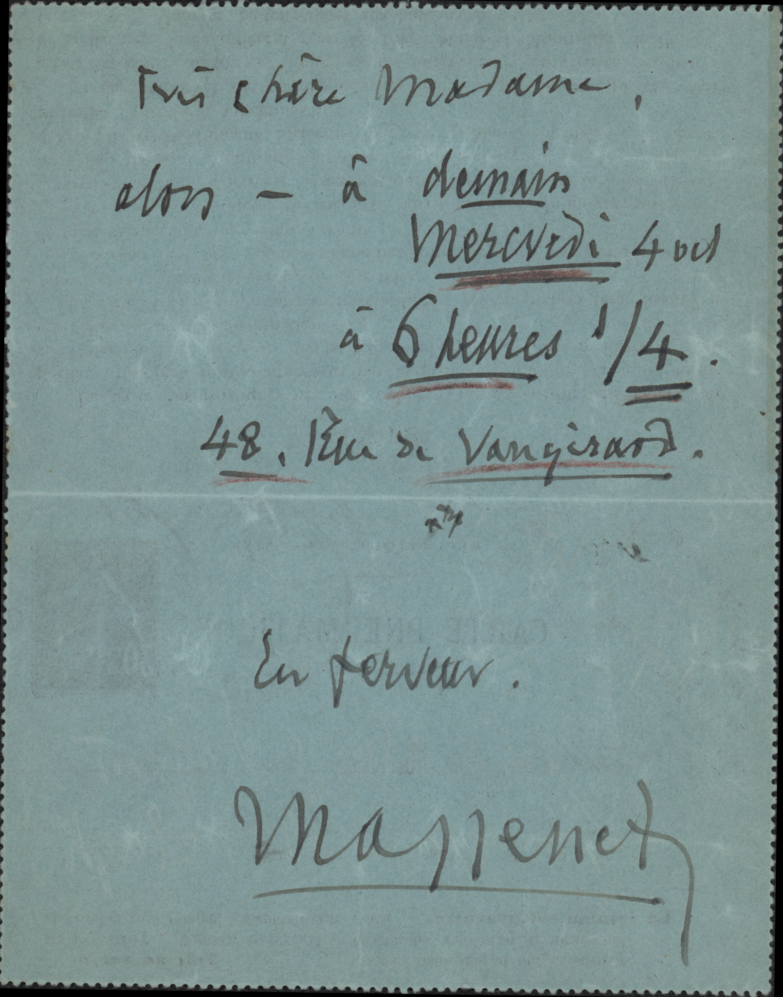 Autograph letter signed by the French composer of the Romantic era. His most frequently staged are Manon (1884) and Werther (1892). He also composed oratorios, ballets, orchestral works, incidental music, piano pieces, songs and other music. Like many prominent French composers of the period, Massenet became a professor at the Conservatoire. He taught composition there from 1878 until 1896, when he resigned after the death of the director, Ambroise Thomas. Among his students were Gustave Charpentier, Ernest Chausson, Reynaldo Hahn and Gabriel Pierné. Addressed to the dramatist Alice Lafont: “…alors – à demain mercredi 4 oct à 6 h….”. 1 p. On carte-pneumatique (11 x 14 cm).