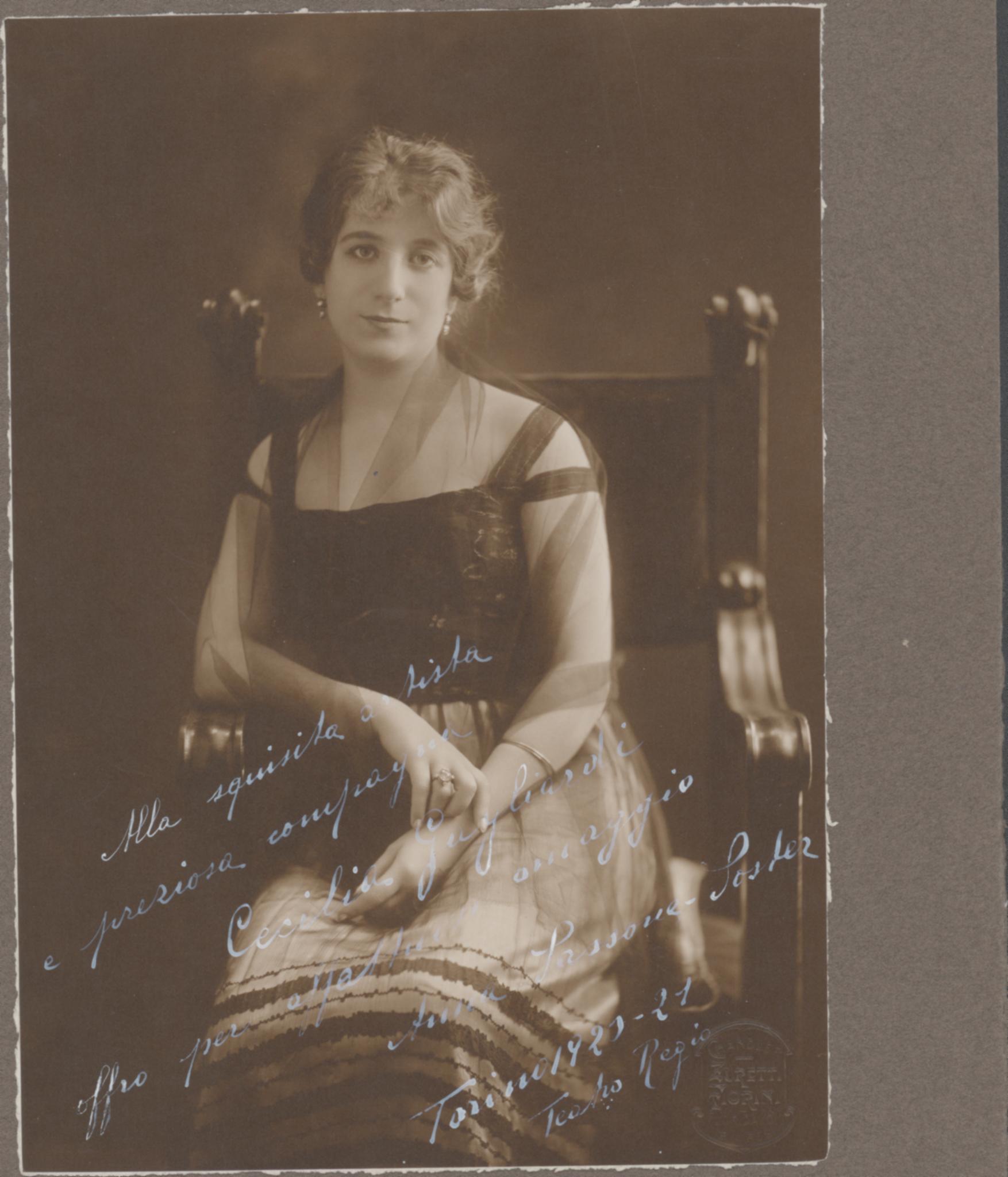 Large photographic portrait with autograph dedication signed, dated “Torino 1923-21 Teatro Regio” of the Italian soprano. He made his debut in 1918 at the Lirico in Milan in Amico Fritz. (19.5 x 22.5 cm).