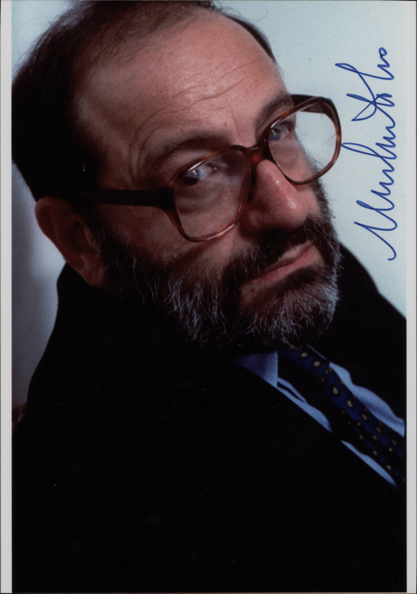 Photographic portrait with autograph signature of the Italian medievalist, philosopher, semiotician, novelist, cultural critic. He is best known for his popular 1980 novel The Name of the Rose, a historical mystery combining semiotics in fiction with biblical analysis, medieval studies and literary theory, as well as Foucault’s Pendulum, his 1988 novel which touches on similar themes. (12 x 18 cm).