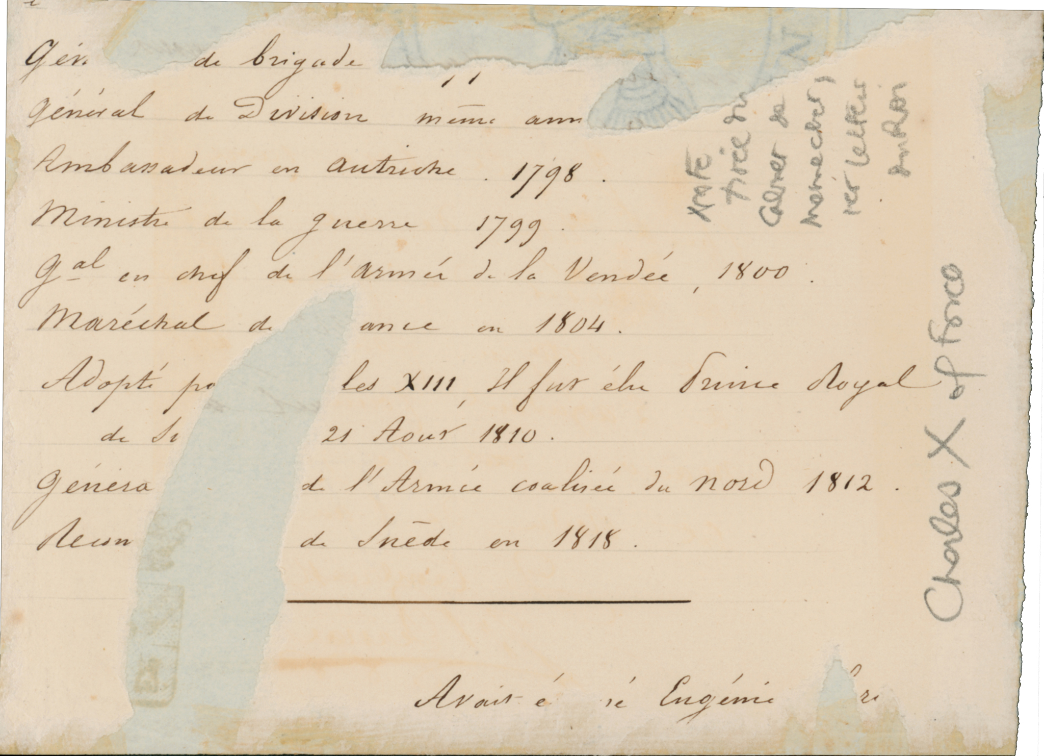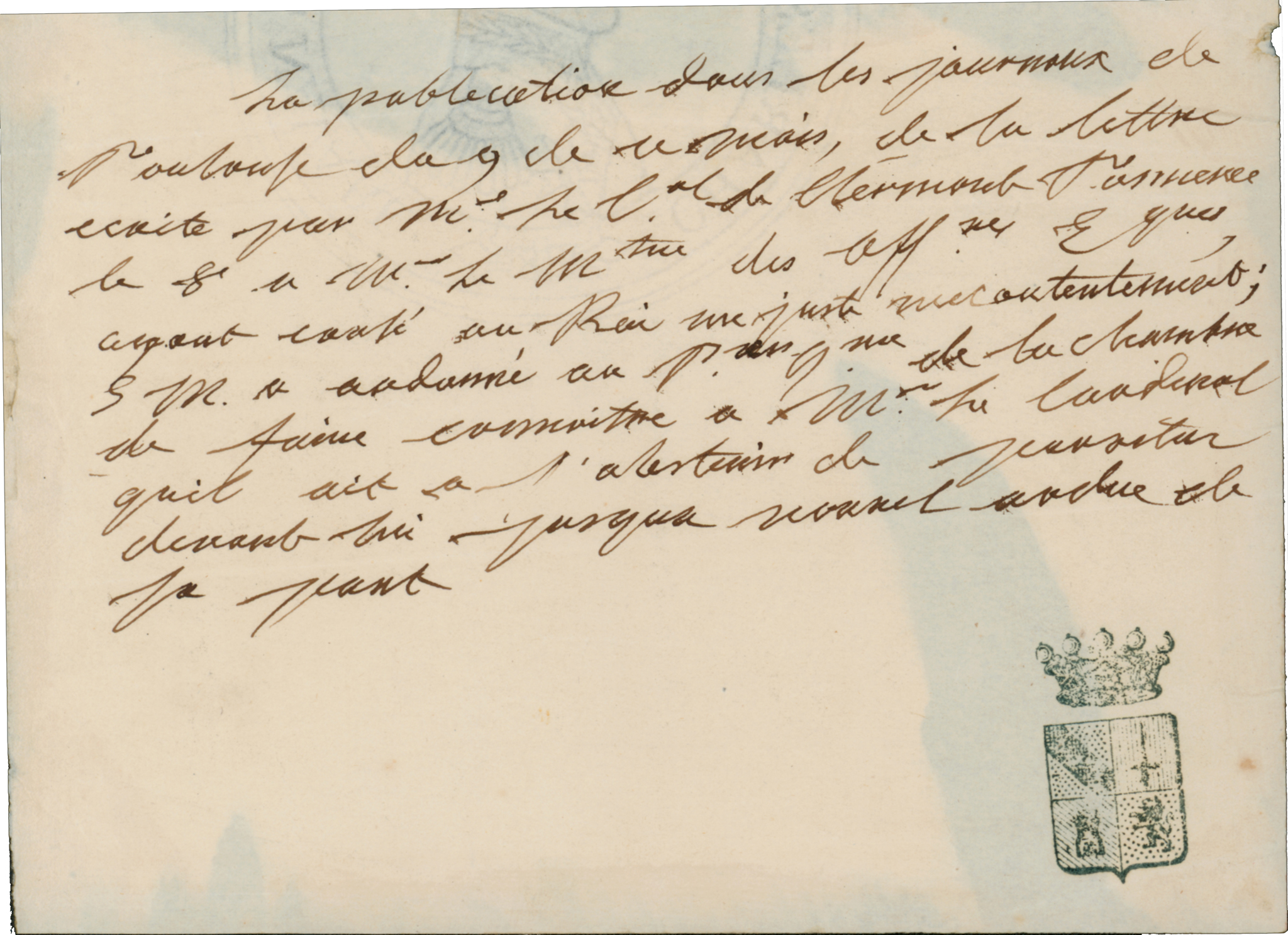 Autograph letter, not dated, by the King of France from 16 September 1824 until 2 August 1830. After the Bourbon Restoration in 1814, Charles (as heir-presumptive) became the leader of the ultra-royalists, a radical monarchist faction within the French court that affirmed absolute monarchy by divine right and opposed the constitutional monarchy concessions towards liberals and the guarantees of civil liberties granted by the Charter of 1814. The King pens a message of discontent against the Cardinal of Cherbourg: “La publication dans les journaux de Toulouse du 9 de ce mois, de la lettre ecréte par M. Le C.al de Cherbourg T… le 8 a M. Le M…. des Aff.. et qui ayant causé au Roi une juste mecontentement…”. 1 p. In-obl. With royal mark.