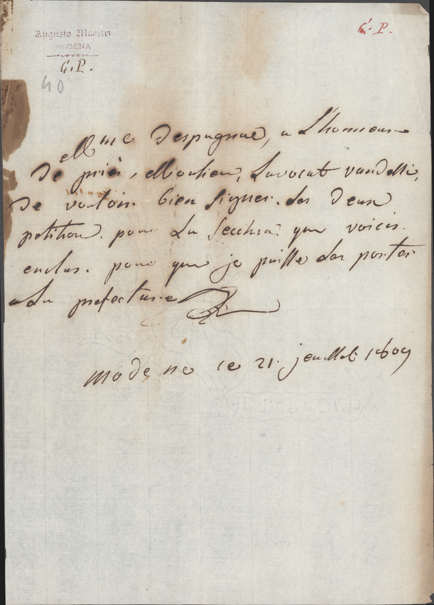 Autograph letter signed, dated Modène le 21 Juillet 1809 by the Comte de Sancerre and Baron d’Espagnac. The Count writes: “Mme d’Espagnac a l’honneur de prier Monsieur l’avocat Vandelli, de vouloir bien signer les deux pétitions pour La Secchia qui sont inclues…”. ½ p. Margin stains.