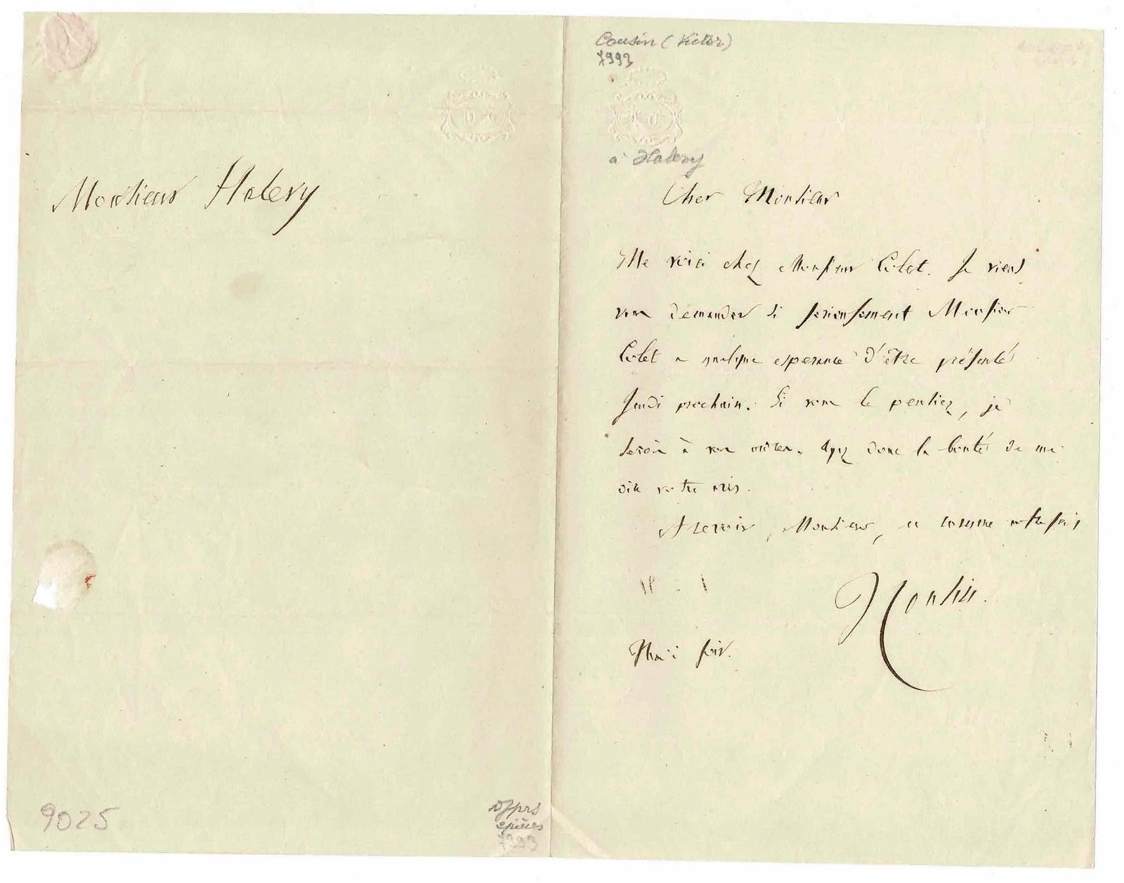 Autograph letter signed “V Cousin” by the composer Fromental Halevy (1799-1862) s.l.n.d. Tuesday evening, 1 p. in-8°, autogr. subscription. Beautiful piece.