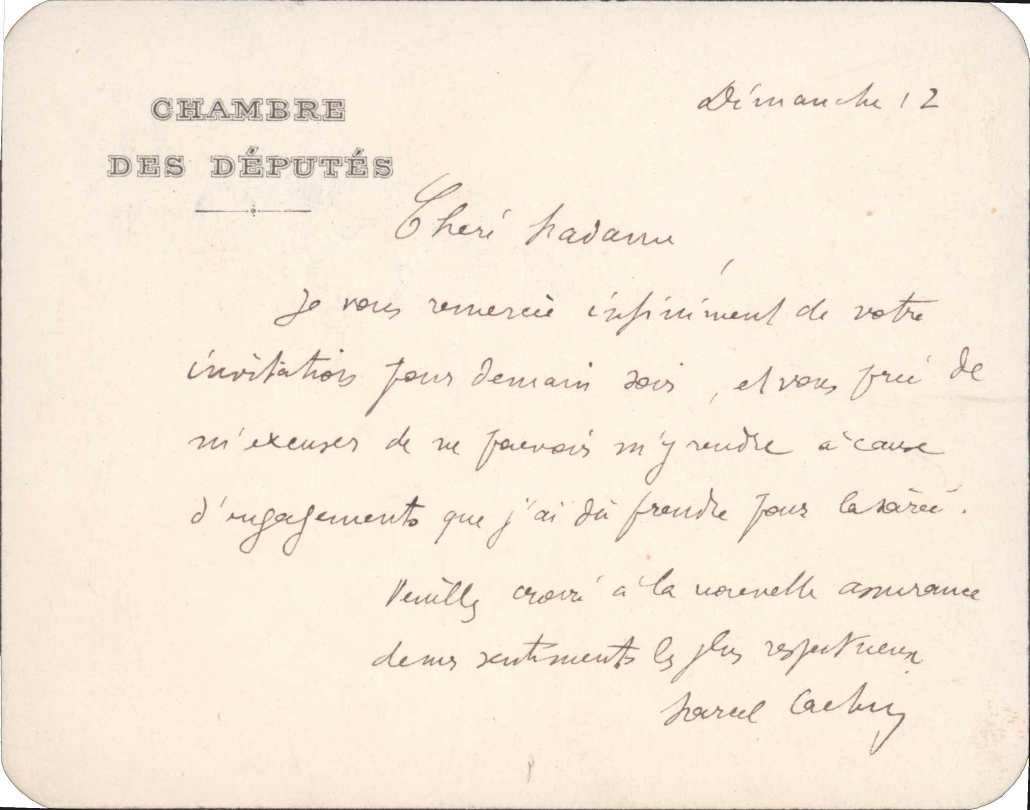 Autograph letter signed dated “Dimanche, 12” by the French politician, director of ‘L’Humanité’ e member of the leadership of the French Communist Party (1923 -1958) in which he declined an invitation “a cause d’engagements que j’ai du prendre pour la soirée…”. 1 p. in-8, with letterhead ‘Chambre des Députés’.