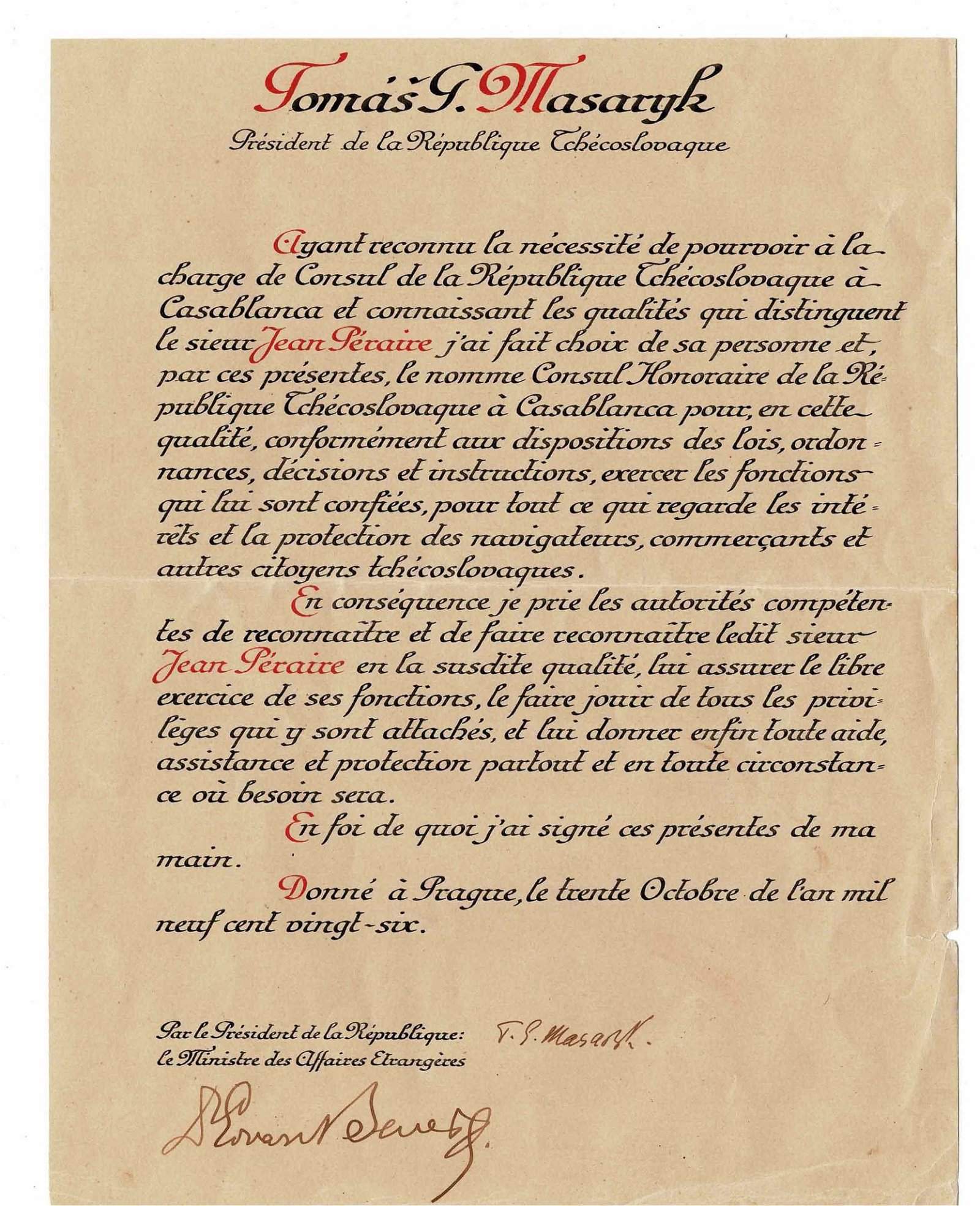 Appointment of the Czechoslovak Consul in Casablanca, Prague, 30.10.1926 signed by Masaryk and Benès. Included. Included: Autograph letter signed dated 12.01.1948 by Masaryk’s stepson. Fine document. – This lot is under temporary import in the UK. 5% VAT is due if delivered in the UK. Imnport VAT will be due if delivered within the EU.