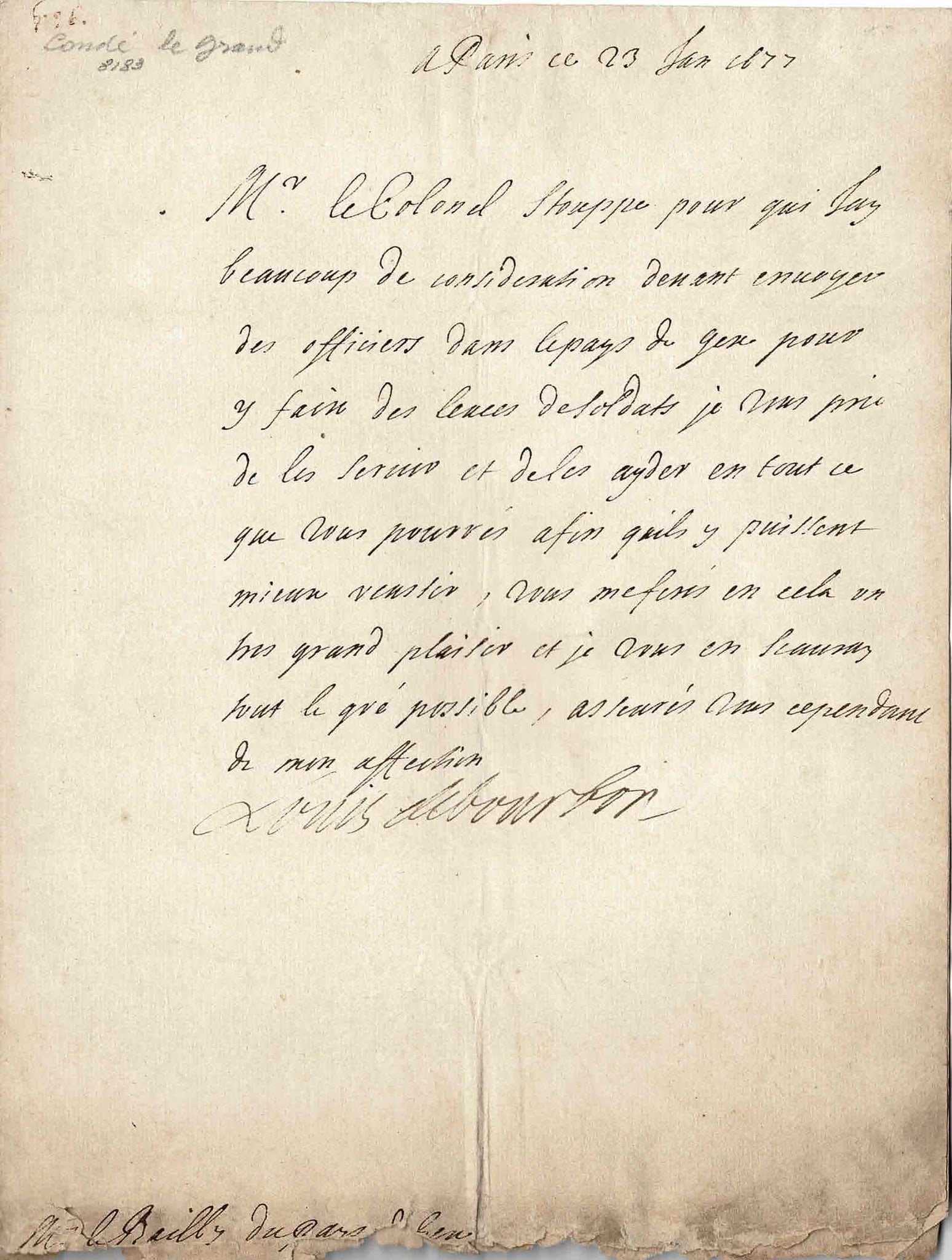 Letter signed and dated Paris, 23.01.1677 to the “Bailli of Gex: “Le colonel Stoppe doit…envoyer des officiers dans le pays de Gex pour y faire des levées de soldats…et le prie d’aider ceux-ci pour qu’ils puissent réussir…”. – This lot is under temporary import in the UK. 5% VAT is due if delivered in the UK. Imnport VAT will be due if delivered within the EU.