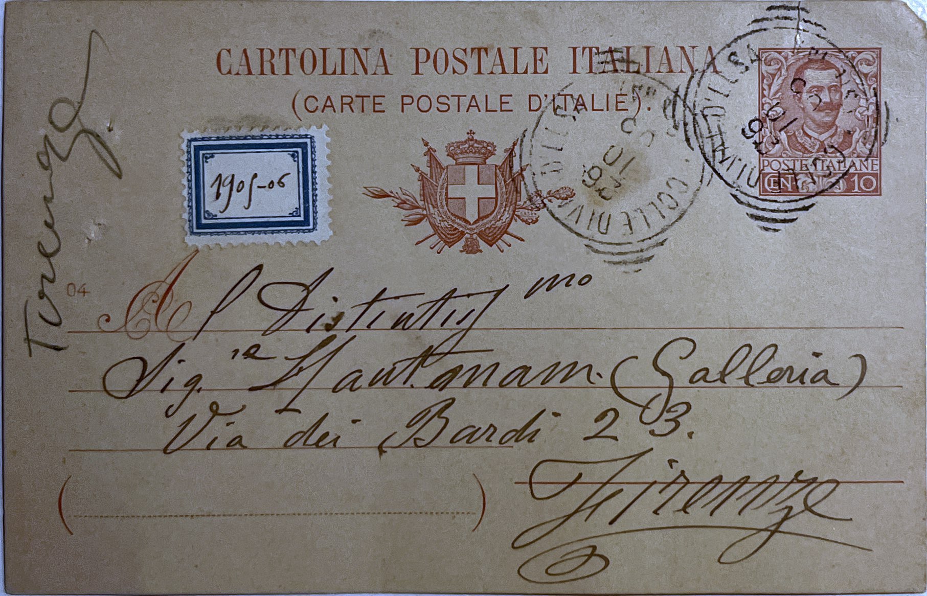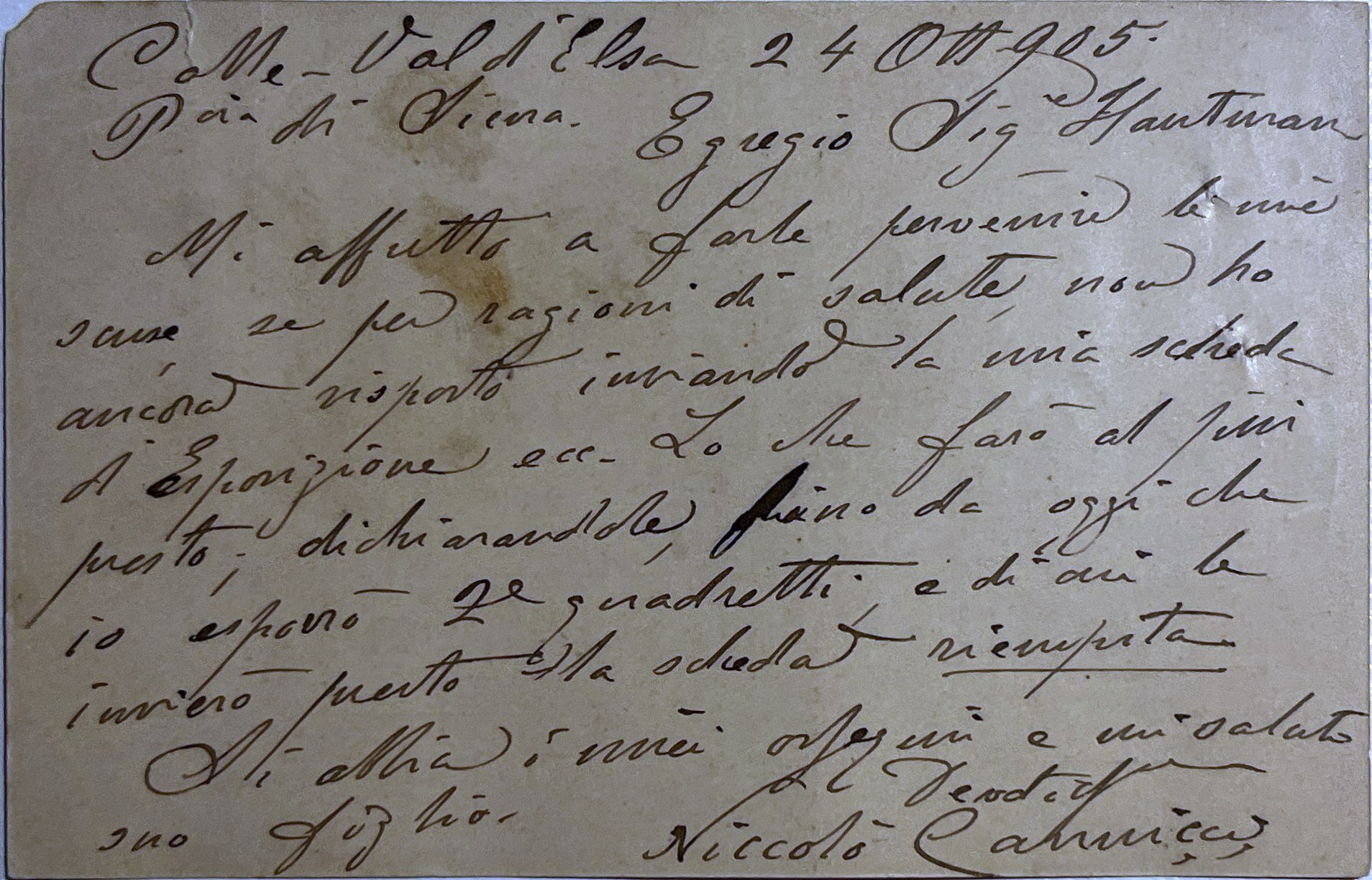 Autograph letter signed on postcard, dated “24 Ott 905” by the Italian painter and illustrator. To Mr. Hautmann: “…Mi affretto a farle pervenire le mie scuse, se per ragioni di salute, non ho ancora risposto inviando la mia scheda di Esposizione (…) dichiarandole fino da oggi che io esporrò 2 quadretti…”. 1 p.